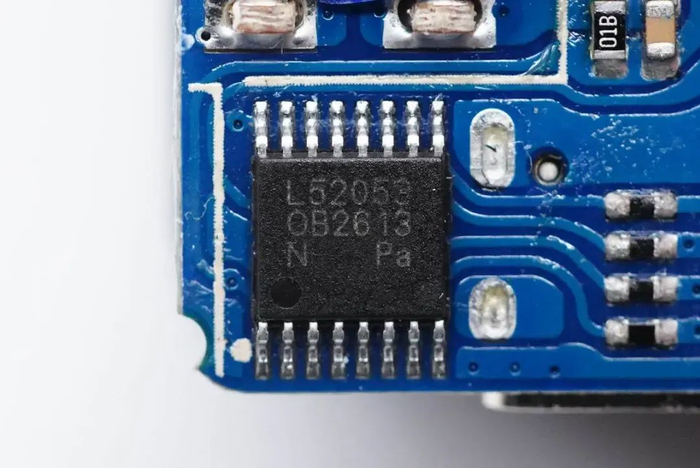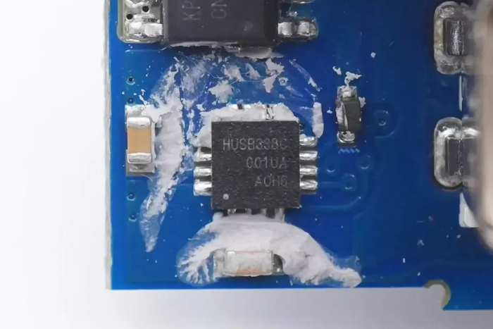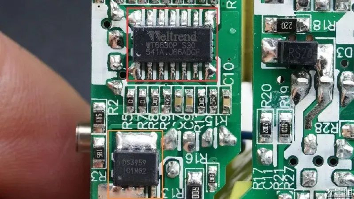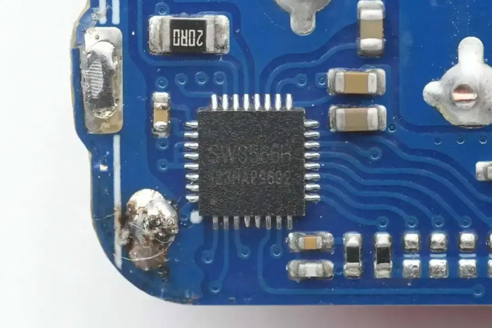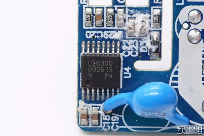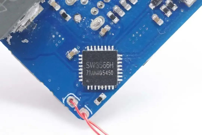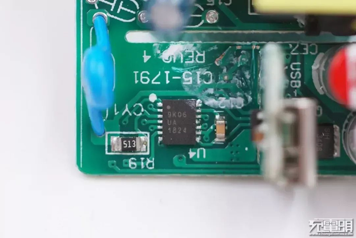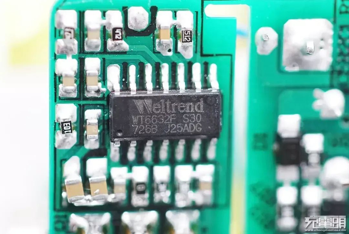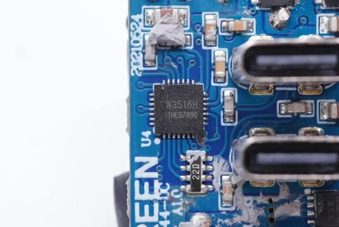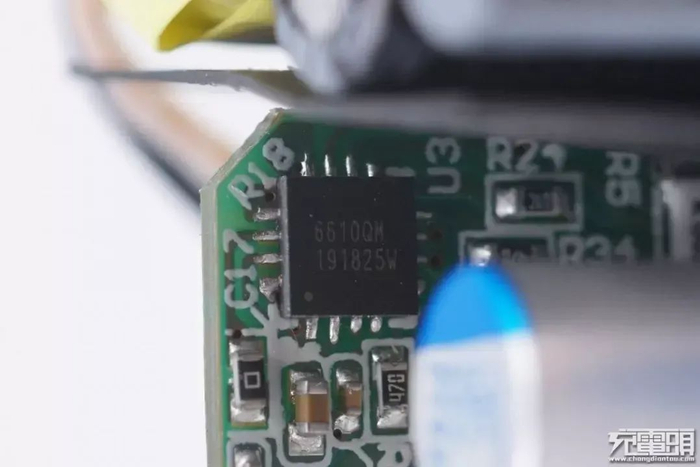 PCB板正面靠近输出接口的位置有一个USB PD协议芯片,为瑞萨iW656P,已经通过了高通QC4+认证。