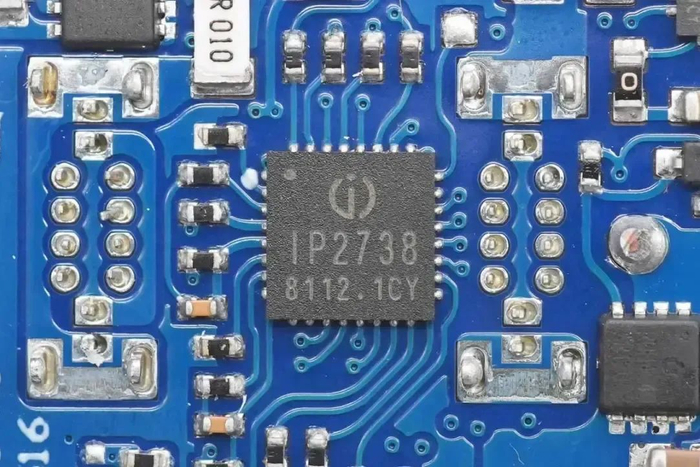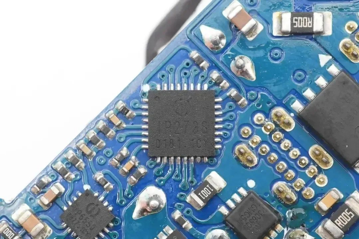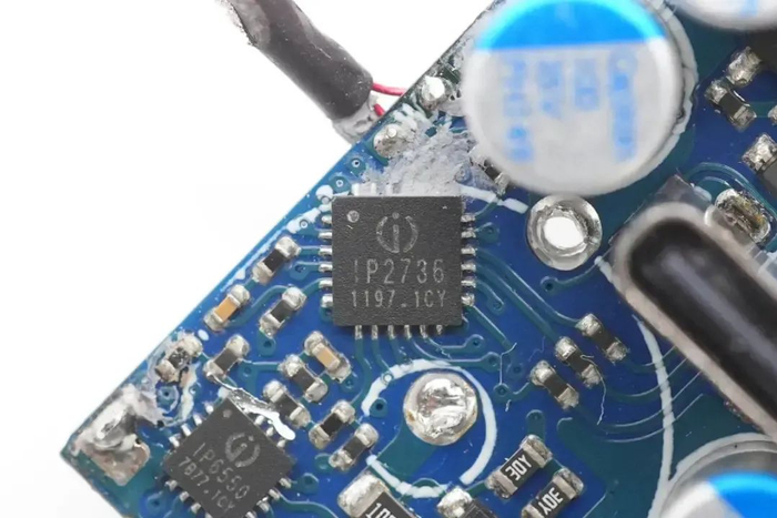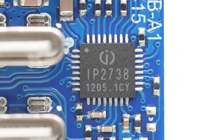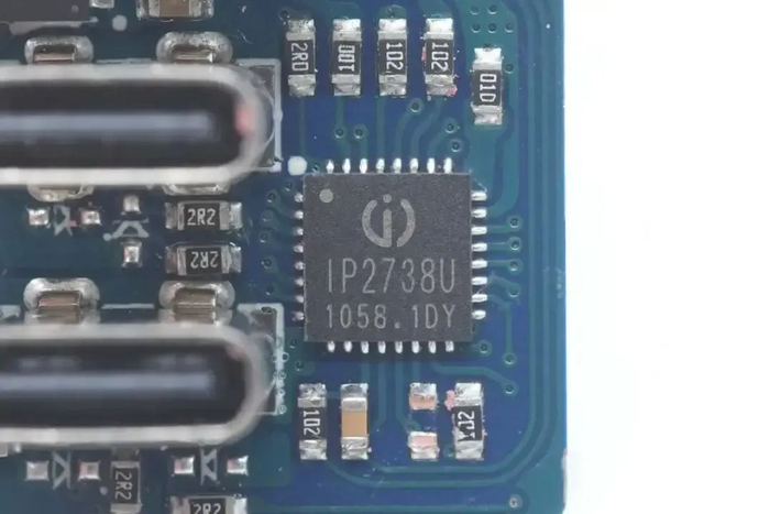 协议芯片采用英集芯IP2738,三个接口输出均由其控制。IP2738是一颗双路协议芯片,支持双口18-140W快充应用,具备独立的反馈控制,具备独立的USB PD控制,相当于两颗IP2736整合到一颗芯片内部,快充规格与IP2736相同。