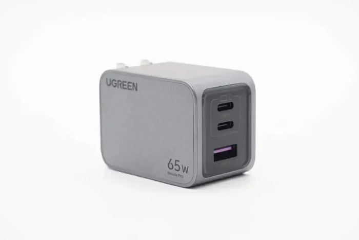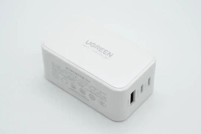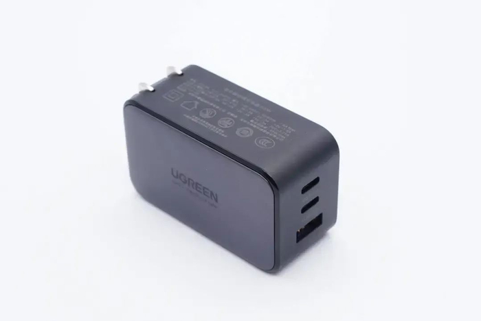 绿联这款65W氮化镓充电器采用切面柱状外观设计,在机身侧面标注65W字样,方便辨认充电器输出功率。充电器配有折叠插脚,便于日常携带与收纳。充电器具备2C1A接口,两个USB-C接口均支持65W快充输出,USB-A口支持22.5W快充。