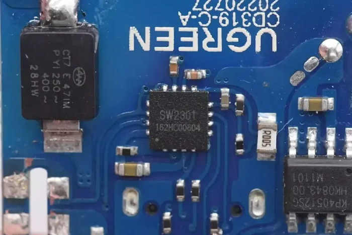 协议芯片采用智融科技SW2301H,这是一款高集成的多协议快充解决方案,支持USB-C和USB-A口应用,支持PD、QC、FCP、AFC、SFCP以及PE等主流快充协议,支持光耦反馈和 FB 反馈两种工作模式。