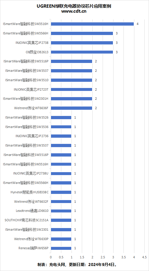 将文章协议芯片实际应用情况绘制成条形图,发现智融SW3516H应用最多,可达4次。
