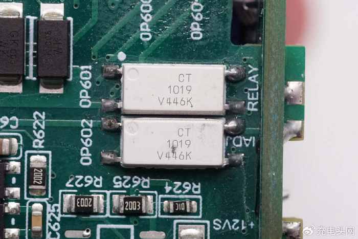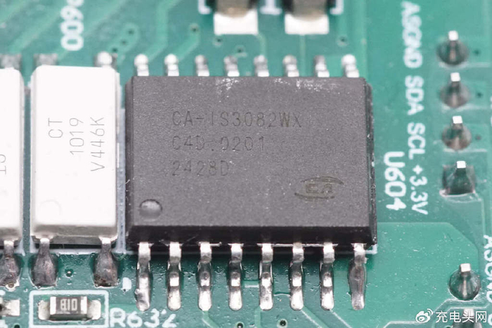 位于两颗CT 1019光耦旁边的芯片为隔离式半双工收发器,来自川土微,型号CA-IS3082WX,该芯片能够承受高达 5000VRMS(60s)的电气隔离以及具有±150kV/μs的典型CMTI性能,支持多节点数据通信总线,最高通信速率为20Mbps,最多允许同一总线上挂接 256 个收发器,支持–40°C 到 125°C 的工作温度范围,采用SOIC-16封装。