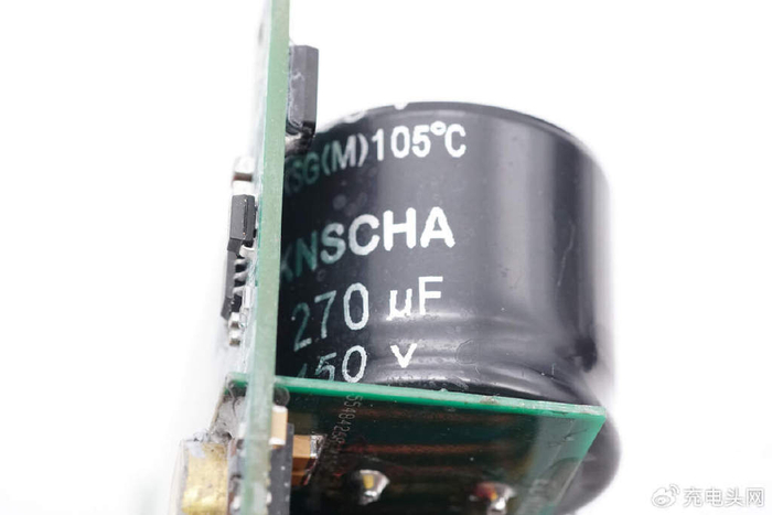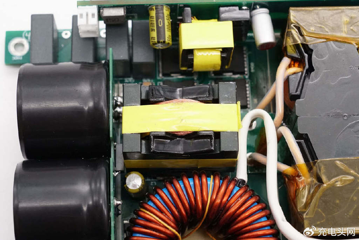 DEMO正面设有保险丝、安规X2电容、PFC电感、变压器,图腾柱慢管,氮化镓半桥,开关管,同步整流控制器等器件,滤波电容采用小板焊接。