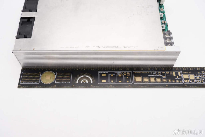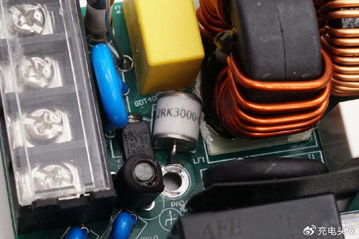 主板背面设有气体放电管、图腾柱PFC控制器以及PFC快、慢管以及LLC拓扑的初次级功率开关管等器件,还设有铜质散热焊柱帮助散热。