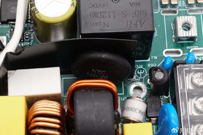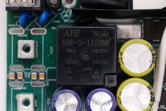 继电器来自爱福,型号GRF-S-112DMP,内置一组常开触点,触点容量80A,线圈电压12V,用于电源输出控制。