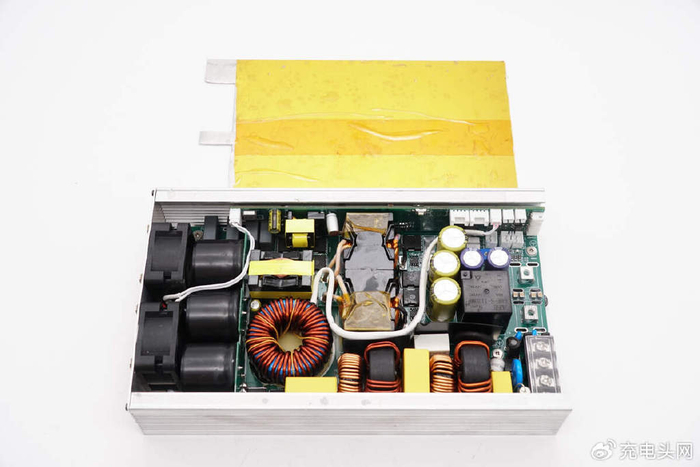 方案内置一颗STC 32 位、128 KB 闪存的高性价比单片机,可实现丰富的智能控制和通信功能,与 1 kW 版本相比,本方案在机壳后侧新增两只小风扇,并于 PCB 背面设有铜质散热焊柱,贴附导热胶,以提升散热能力;外壳采用灌胶工艺,实现出色的防尘防水保护。整机 PCBA 工艺简洁、BOM 成本低廉、程序配置灵活又便于保密,是真正的一款高效、可靠、易量产的多场景电源解决方案。