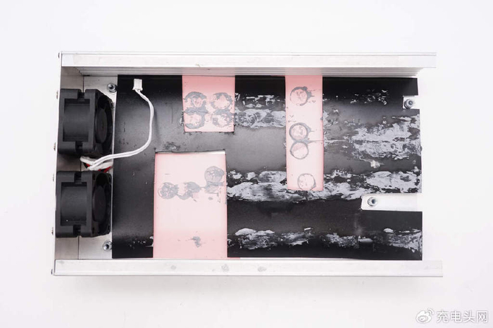 再将底部外壳去掉,可以看到内置麦拉片实现绝缘,麦拉片开口方便PCB底部的铜质散热焊柱接触里面的导热垫帮助传递热量。