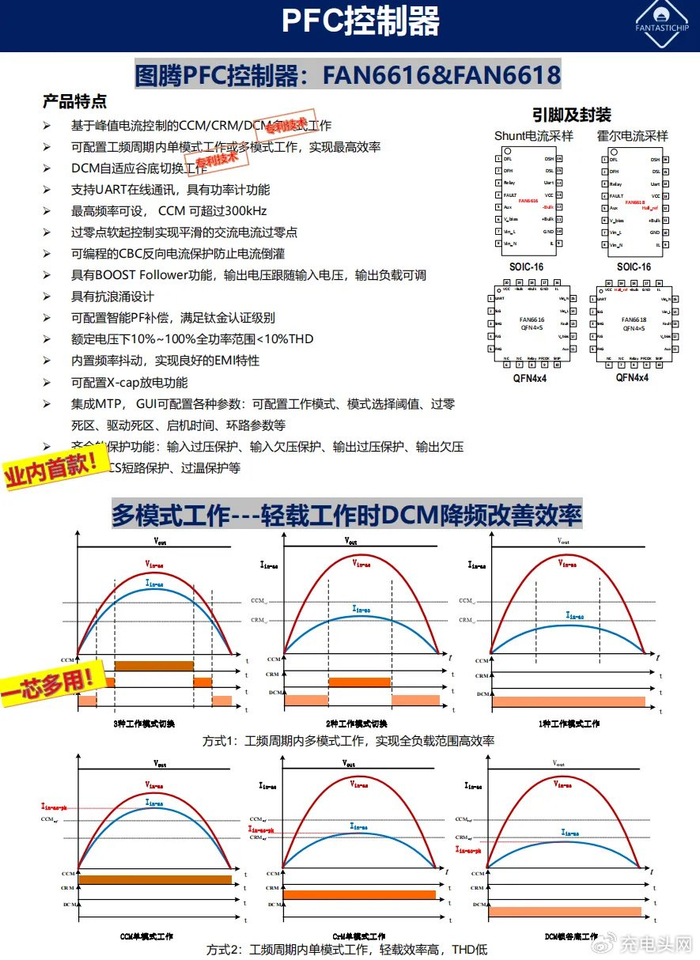 图腾柱PFC控制器来自梵塔,型号FAN6618,是一颗高性能多模式的图腾柱PFC控制器,支持基于峰值电流控制的CCM/CRM/DCM多模式工作,DCM自适应谷底切换工作,可配置工频周期内单模式工作或多模式工作,实现最高效率。