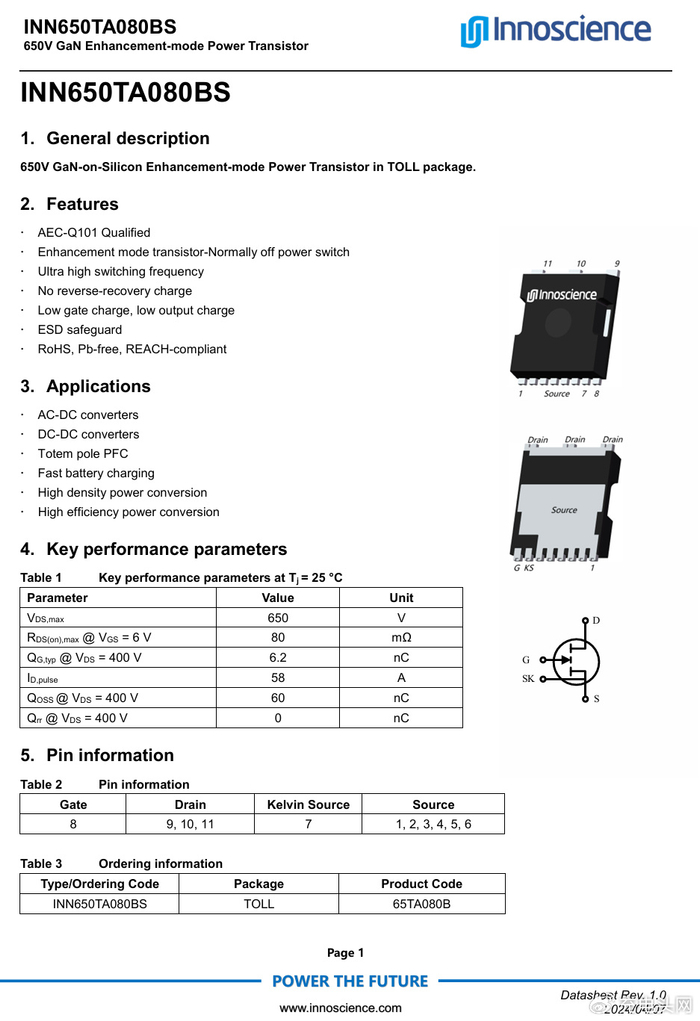 氮化镓快速半桥采用港晟委托英诺赛科定制的INN650TA080GS(实为INN650TA080BS,二者仅尾缀不同),这是一款耐压650V的增强型氮化镓开关管,瞬态耐压800V,导阻80mΩ,具备开尔文源极,符合AEC-Q101认证,采用TOLL封装。