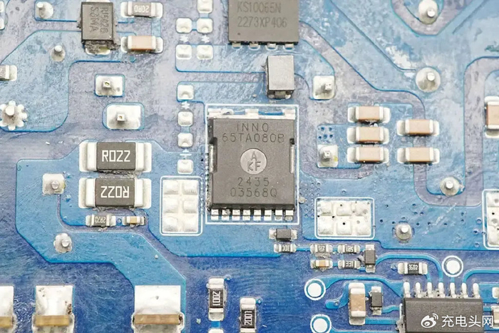 该芯片是港晟委托英诺赛科定制的INN650TA080GS(实为INN650TA080BS,二者仅尾缀不同),这是一款耐压650V的增强型氮化镓开关管,瞬态耐压800V,导阻80mΩ,具备开尔文源极,符合AEC-Q101认证,采用TOLL封装。