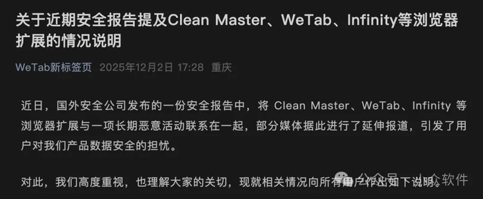 WeTab 做出了官方回应(关于近期安全报告提及Clean Master、WeTab、Infinity等浏览器扩展的情况说明,核心内容如下: