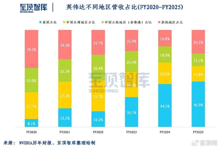 分地区来看,美国业务在英伟达营收占比逐渐增加,从2020财年的8.1%上升至2025财年的46.9%,成为英伟达营收贡献最大的地区。美国作为人工智能、云计算、自动驾驶等领域的全球领先者,以亚马逊、谷歌、微软、Meta为代表的科技巨头不断扩大美国本土数据中心的建设规模,对高性能GPU及算力基础设施的需求持续增加。中国大陆地区(含香港)营收占比不高,2025财年占比不到15%,原因在于美国政府近年出台多项管控措施,限制英伟达高性能芯片等产品对华出口。2022年8月,英伟达称被美国政府要求禁止向中国出口两款旗舰GPU芯片A100和H100。2023年10月,美国商务部工业和安全局(BIS)更新发布对华半导体出口管制规定,进一步收紧AI芯片限制措施,英伟达在2022年芯片出口禁令之后为中国市场推出的A800、H800等“特供”芯片也被纳入限制。
