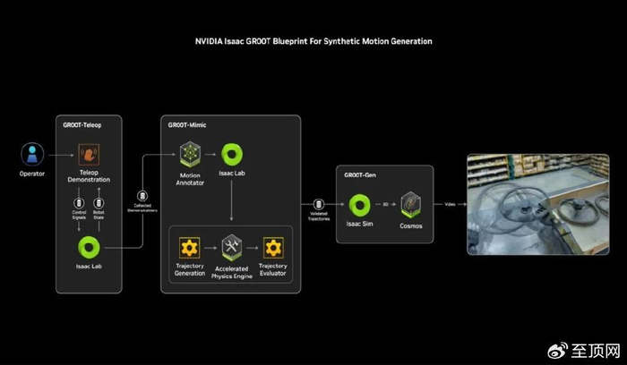 英伟达在CES 2025推出用于合成运动生成的NVIDIA Isaac GROOT机器人开发平台,该平台可帮助开发者生成海量的合成运动数据,以便通过模仿学习来训练人形机器人。