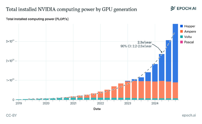 2019年以来,英伟达芯片的总算力规模呈现逐年增长走势。根据Epoch AI统计,2021-2023年Ampere架构芯片(A100为代表)所消耗的算力逐年增长。用于更高性能的Hopper架构芯片(H100为代表)所消耗的算力自2023年以来呈快速上涨趋势。随着接入各类开源和推理模型的企业和机构逐渐增多,庞大的用户使用量对于数据中心服务器造成较大压力。在此背景下,全球主要云厂商将不断扩大数据中心规模,英伟达高性能芯片所产生的算力规模还会持续增加。