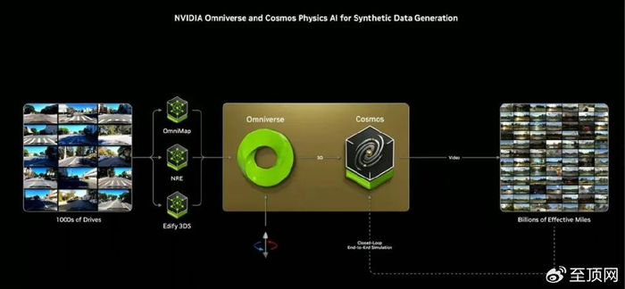 此外,英伟达利用Omniverse和Cosmos创建的“AI数据工厂”,通过合成驾驶场景大幅扩展训练数据。包括OmniMap:融合地图和地理空间数据,构建可驾驶的3D环境;NRE:利用传感器日志生成高保真的4D仿真环境,并为训练数据生成场景变化;Edify 3DS:从资产库搜索或生成新资产,创建用于仿真场景。通过相关技术,NVIDIA将数百次的驾驶场景扩展为数十亿的有效里程,大幅增加实现安全和先进自动驾驶功能所需的数据集规模。