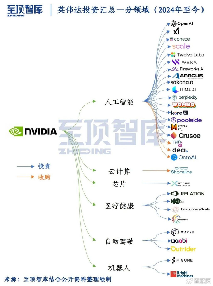 根据至顶智库统计,英伟达在2024年的对外投资主要集中于人工智能领域,相关投资企业数量近20家,涵盖AI搜索、智能交互、基础设施、AI模型等多个方向。在基础设施方面,英伟达投资Scale AI等数据标注公司;在模型方面,投资OpenAI、Mistral AI等顶尖大模型研发机构;在应用方面,与Kora.ai、Twelve Labs等不同行业企业展开合作,旨在巩固其在全球AI生态中的核心地位。