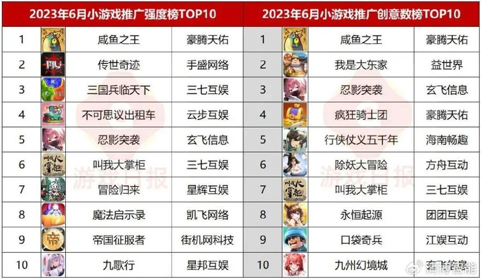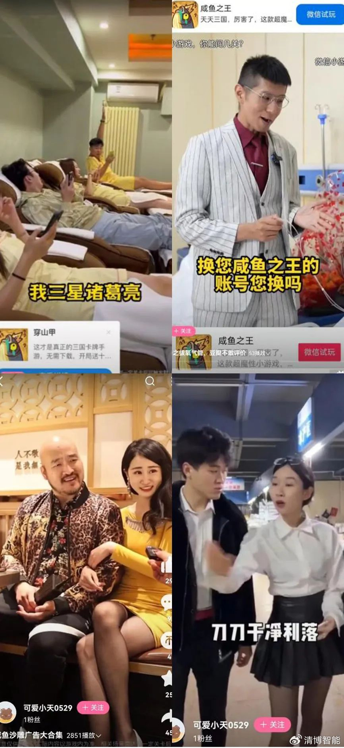 AppGrowing游理游据研究院的数据显示,6月小游戏推广榜单上,咸鱼之王斩获推广强度和推广创意桂冠。小游戏一哥稳坐“买量”第一。谈到《咸鱼之王》的广告,其主打的也是一个简单粗暴的。有的广告视频,不限时间场合,几个人或是在大马路上、或者吃着火锅、或是做着洗浴按摩,便激烈地谈论起游戏攻略;有的广告,走擦边风格,但内容却十分“正经”,拿着大哥大的大老板带着对象,满脸得意地炫耀着自己的咸鱼之王战斗力;还有的广告可谓离谱出了新高度,穿着西装,一本正经地问,“先生,您愿意用我手中的氧气管换你的《咸鱼之王》的账号吗?”......