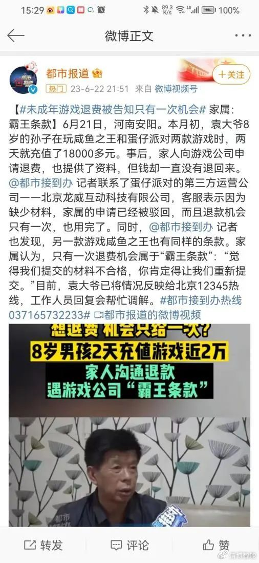 此前,有媒体报道称,一位老人的孙子在玩《咸鱼之王》时,充值了上万元。但《咸鱼之王》以缺少材料为由,驳回了申诉,拒绝退款,而且还亮出了自己的“霸王条款”,表示只支持一次退款业务,无论退款是否成功。