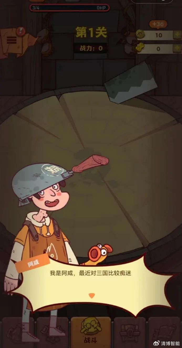 如今爆火的《咸鱼之王》,其类型是卡牌类游戏,较前者虽然稍显复杂化,但与同类的卡牌游戏相比,例如《炉石传说》《阴阳师》,其故事线、视觉设计和操作玩法都显得极为简单。新手玩家进入游戏,故事前情只有简单的三句话。首先,故事的主人公叫阿咸,看得出是取了“咸鱼之王”的一个“咸”字,而且他头上还扣了个“咸”锅盖,主题贯彻得非常简单粗暴。