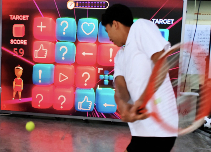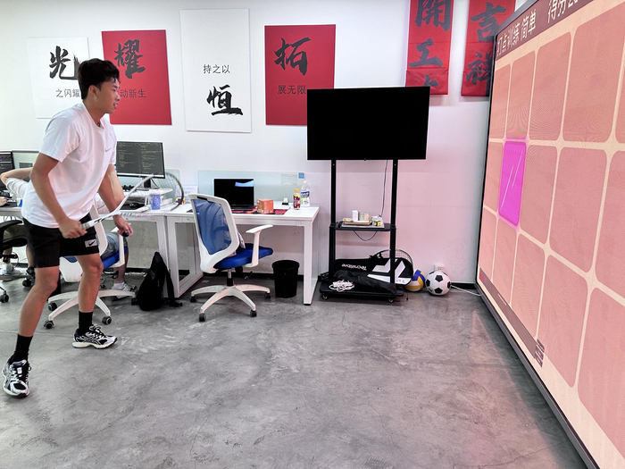 耀动魔方能够承受运动员高强度的击打训练,确保安全可靠。它通过“多模态智能交互”技术,实时捕捉用户动作、力量与身体指标。“比如壁球训练,系统会给出精确击打点,实时反馈速度、准确率和失误率数据。”熊银平解释。设备内置的多种运动内容涵盖壁球、网球、足球、篮球及双人红蓝对战等模式,既能满足专业运动员的精准训练需求,也通过游戏化设计降低大众参与门槛。