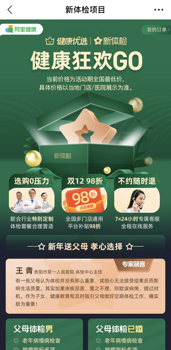 12月10日,记者获悉,基于体检套餐专业度高、用户难以选择最适合自己的体检产品等困扰,阿里健康在支付宝上线了“健康优选新体检”服务,联合体检行业专家针对中青年体检、中老年体检、女性体检、入职体检、全身深度体检、父母体检、肿瘤体检7大需求最高的体检类型搭建了同水平项目的标准体检套餐。