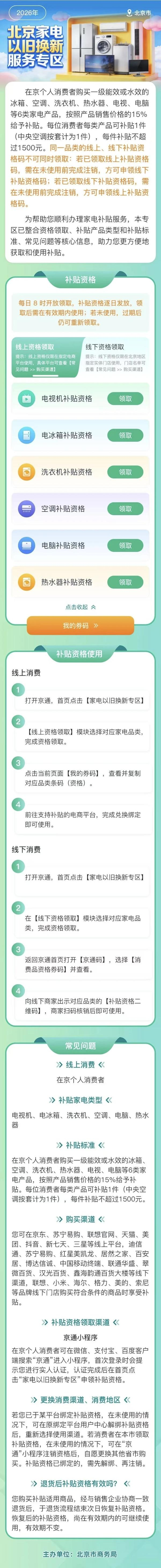 记者从北京市商务局获悉,北京市将于2026年1月1日起,接续实施家电、数码等领域消费品以旧换新补贴。2026年1月1日起,补贴资格每日上午8点开始发放,消费者可通过京通小程序“家电、数码以旧换新专区”领取线上或线下补贴资格。