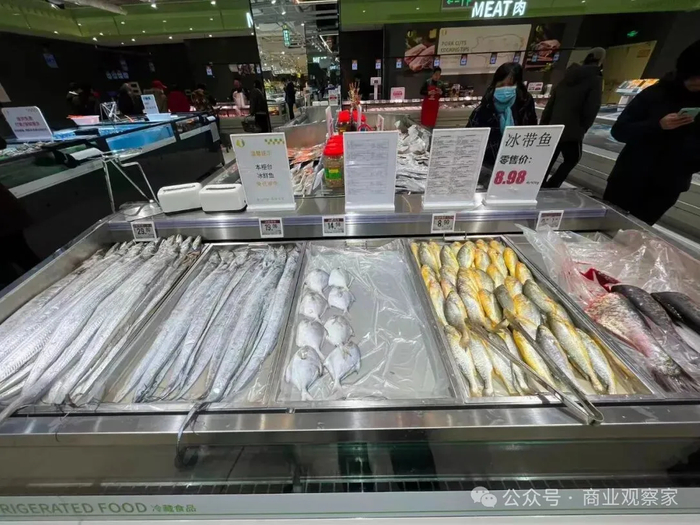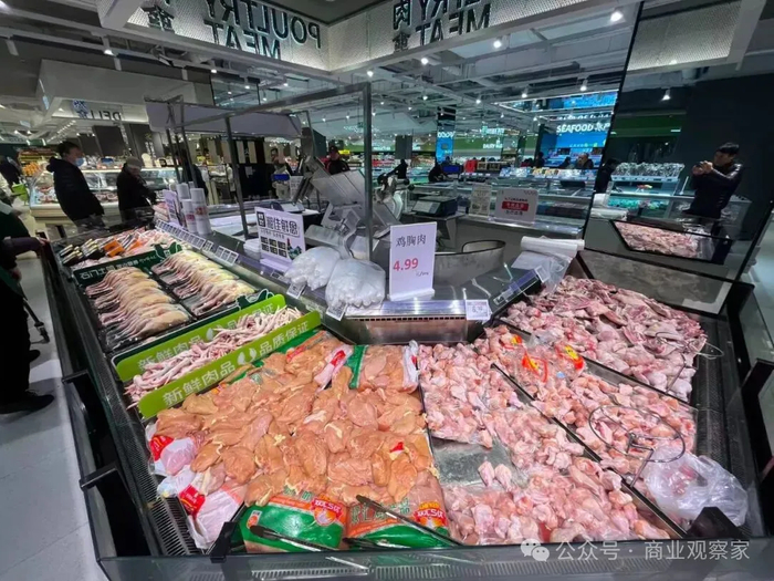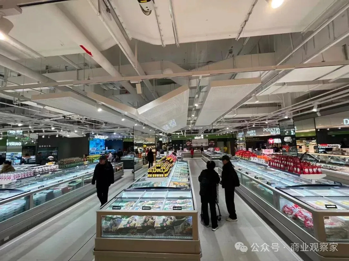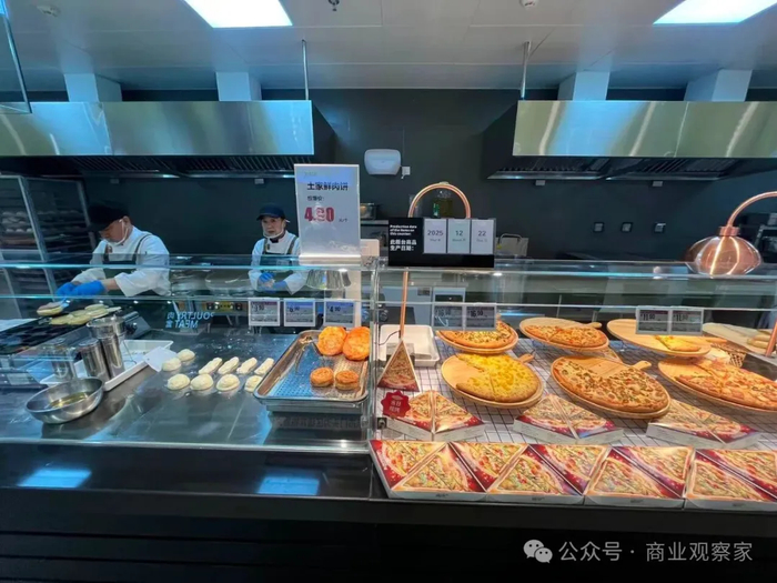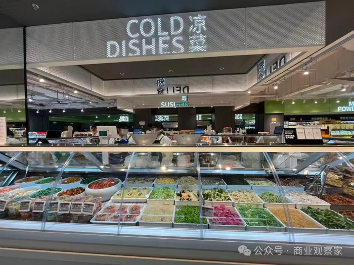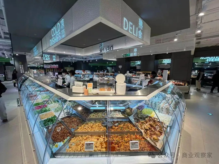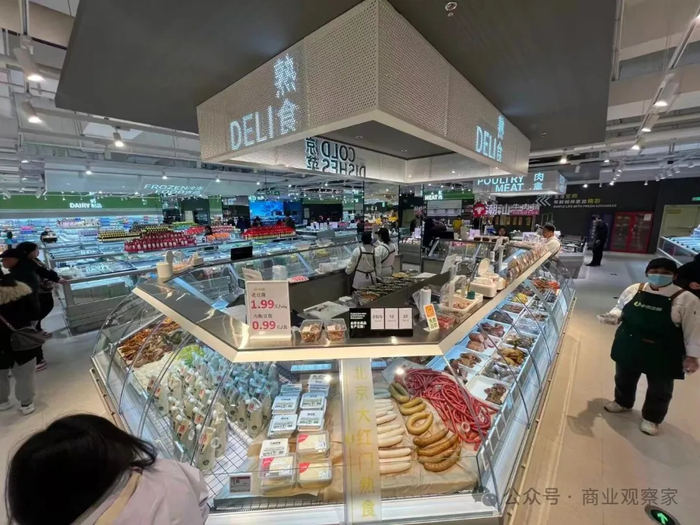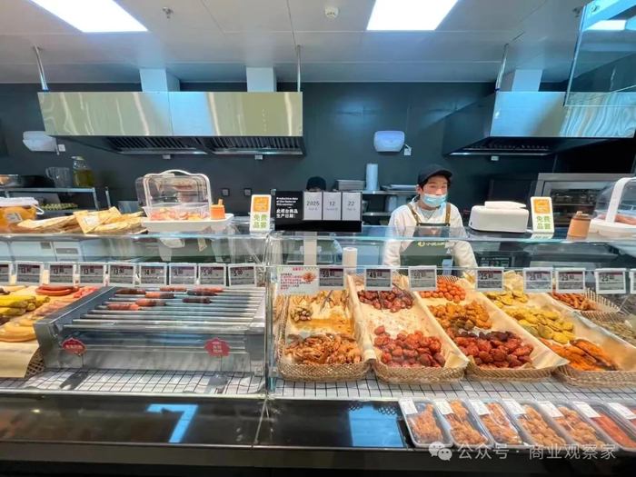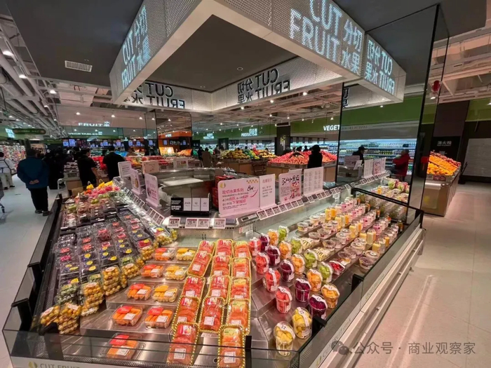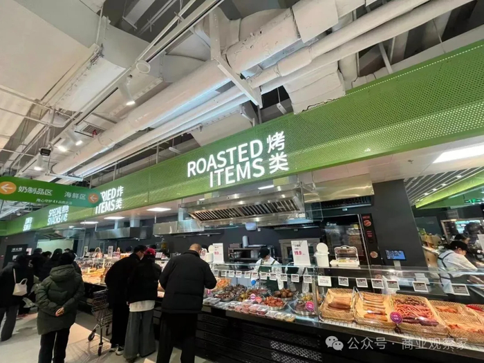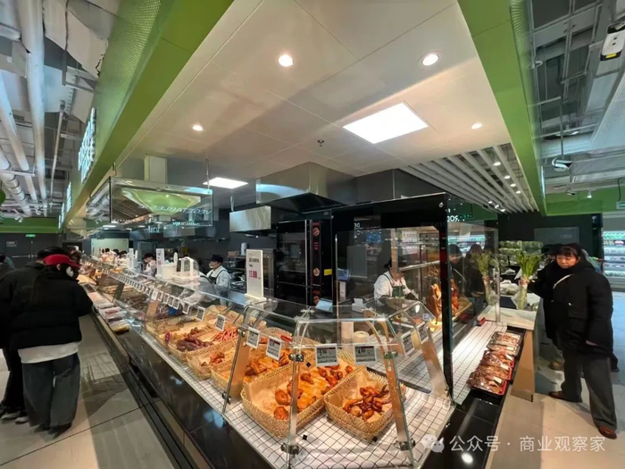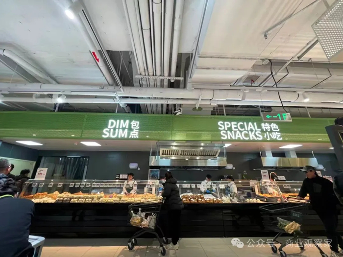 小优生鲜的3R区,整体给《商业观察家》的感觉是,“规模效应”相对不明显,相比当下的一些“调改店”与新超市品牌店,小优生鲜的3R区在功能区块及商品体量上,少了一个“环岛”;轻食供给相对更少;现制热食及加工项也相对少一点,包括一些现制互动项、表演项,比如现煎牛排、烤煮、糖水、现制茶饮、现制炒货、堂食互动区等等,这些能带来一些热气腾腾烟火气氛围感的现制互动项、表演项,小优生鲜的“规模效应”相对可能有所不足。