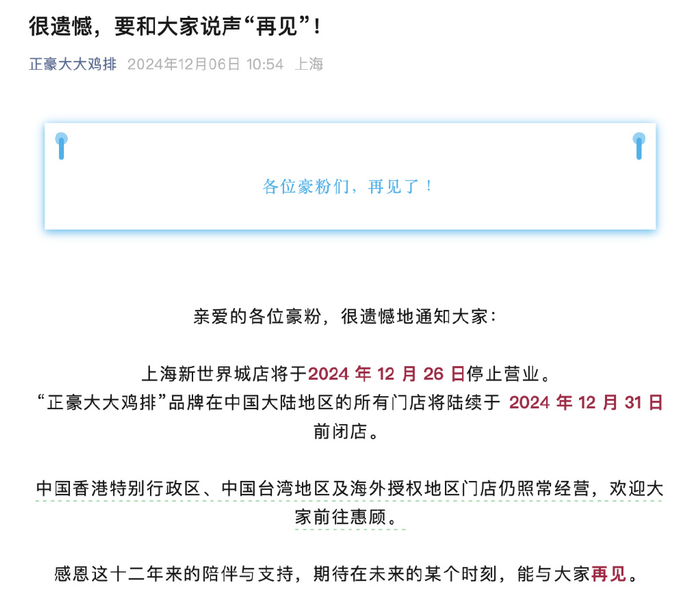 12月6日,正豪大大鸡排发布公告称,上海新世界城店将于2024年12月26日停止营业。“正豪大大鸡排”品牌在中国大陆的所有门店将陆续于2024年12月31日前闭店,中国香港特别行政区、中国台湾地区及海外授权地区门店仍照常经营。