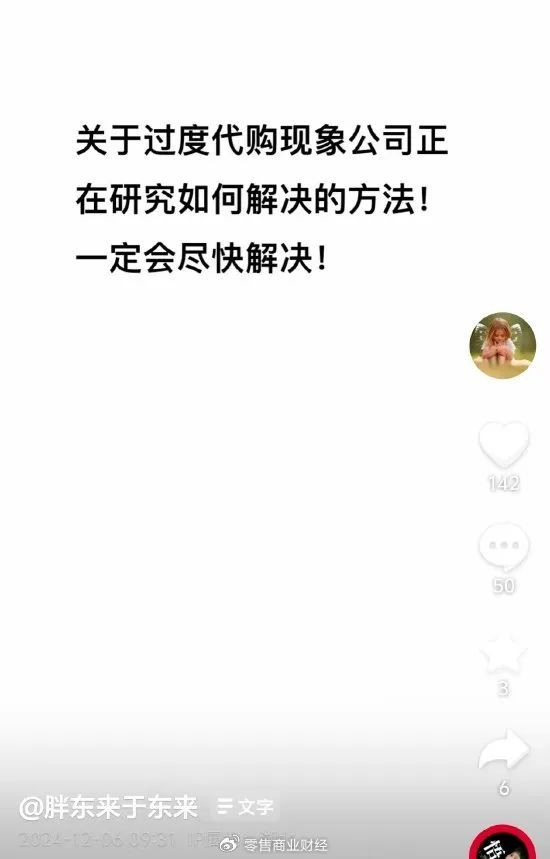 胖东来创始人于东来12月6日在抖音上发文称,“关于过度代购现象公司正在研究如何解决的方法!一定会尽快解决!”此前他还发文称,胖东来不会在网上直播带货,请网友们不要上当。