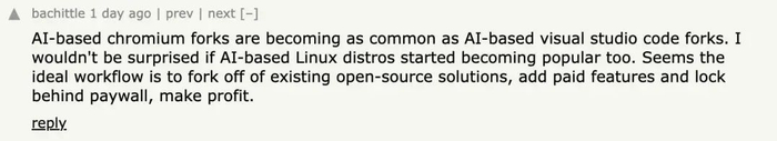 一位网友调侃道:“现在,基于 AI 的 Chromium 分支几乎跟 AI 版 VS Code 分支一样泛滥了。说不定哪天连 Linux 发行版都要开始 AI 化了。当前最热门的创业模式看起来就是:基于开源项目做分叉,添加付费功能,设上 paywall,然后开始赚钱。”