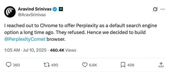 更有趣的是,Srinivas 最近又在 X(原推特)上补了一刀。他透露自己曾早早联系 Chrome,希望将 Perplexity 加入默认搜索引擎选项,却遭到 Google 拒绝。“所以我们决定自己造浏览器。”他说。