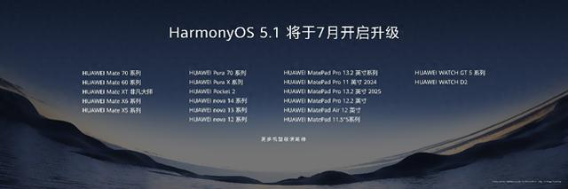 【ZOL中关村在线原创新闻】6月11日,在华为Pura 80系列及全场景新品发布会上,首发搭载HarmonyOS 5.1的华为Pura 80系列新机正式和大家见面。同时,华为还官宣将于7月开启HarmonyOS 5.1的升级推送,包含华为Mate 70系列、华为Pura X、华为MatePad Pro 13.2英寸等在内的多款机型出现在了首批升级名单中。