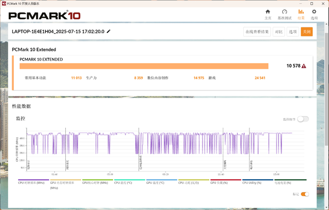 整机性能方面,使用PCMARK 10 Extreme进行测试,得到总分10578。其中常用基本功能为11013、生产力为8359、数位内容创作为14975、游戏为24541。从各项成绩来看,COLORFIRE MEOW R16 Pro有着优异的游戏性能,同时在创作方面也有着不俗的能力。