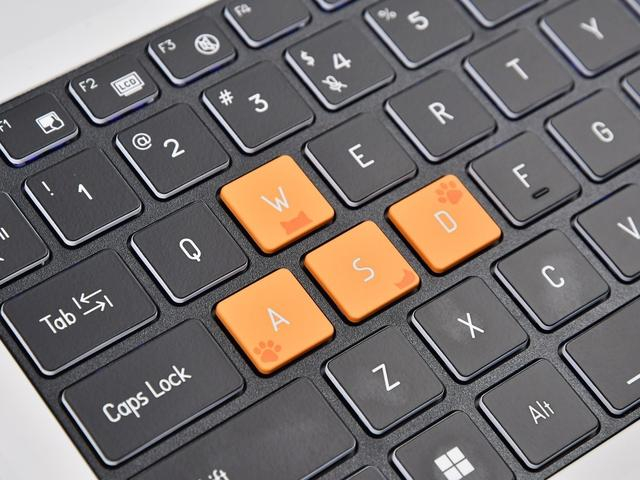 键盘方面,除了WASD定制键帽外,键盘的布局也非常合理,有标准大小的四个方向键和独立数字键区,使用方便。另外键盘也支持彩色背光,用户可以自定义颜色。个人比较倾向于设置成橘色,与橘宝IP更搭。