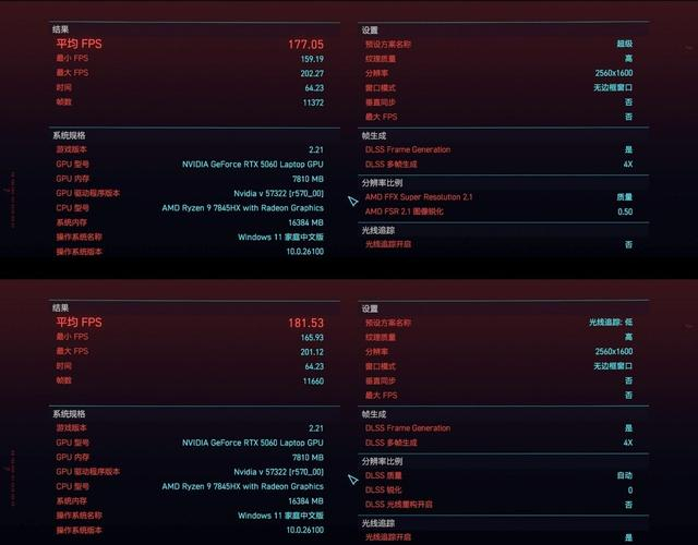 《赛博朋克2077》也测试了两个画质模式,均在4倍多帧生成下进行。在预设超级画质下,游戏的平均帧数为177.05,流畅度优秀;在预设光线追踪:低下,游戏的平均帧数为181.53,同样非常流畅,体验不错。