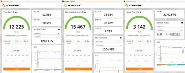 使用3DMARK进行测试,在Time Spy模式(DX12 2K)下总分为12225、显卡分12568;在Fire Strike Extreme模式(DX11 2K)下总分为15467、显卡分15934;在Speed Way模式(DX12U 2K)下的成绩为3142。从成绩可以看出,RTX 5060 Laptop确实是满血性能,在目前游戏本市场中属于中端水平。