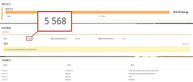 续航测试首先我们参考PCMark 10办公模式,在开启集显输出、节能模式、40%屏幕亮度、30%音量、WiFi、蓝牙全开的情况下,机械革命耀世16 Ultra续航时间达到了10小时47分钟,此时其性能评分为5568分,而同样设置插电状态下,参考PCMark 10办公模式测试,总分为5747分,离电性能损耗仅为3%。