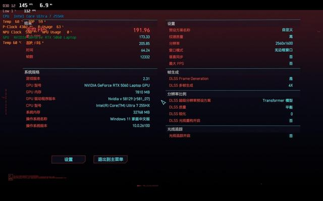 接下来我们再看看酷睿Ultra 7 255HX处理器的游戏性能表现,以及机械革命耀世16 Ultra这款AI高静游戏本在高能狂暴模式和静音狂暴模式下的游戏性能损耗情况。测试时我们开启2.5K分辨率、高画质预设、DLSS平衡模式,支持多帧生成的游戏开至4X。