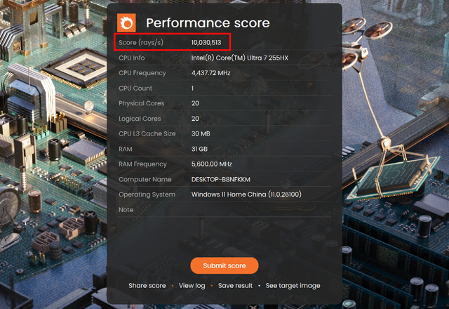 应用测试的最后一部分我们来看看酷睿Ultra 7 255HX处理器的物理渲染能力,首先参考V-Ray渲染器的Benchmark测试,1分钟渲染采样率达到了31593 vsamples,速度极快。