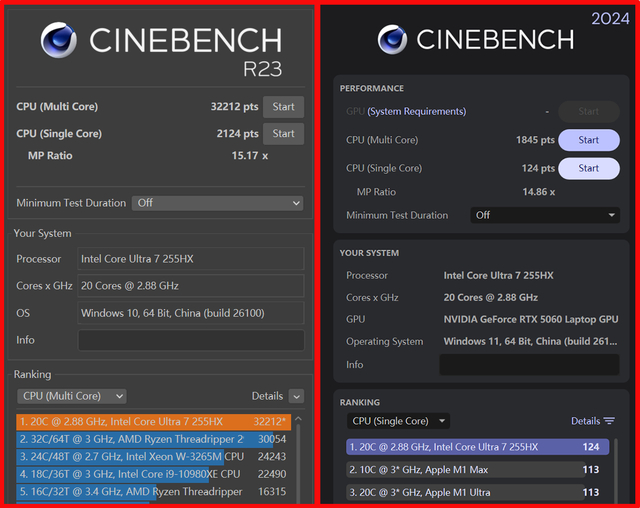 CINEBENCH R23和2024测试标准下,R23单核得分突破2000分,达到了2124分,多核得分32212分,相比同级别的友商阵营处理器有着显著的性能优势。同时2024测试标准下,其单核得分达到了124,多核得分达到了1845,从CPU-Z和CINEBENCH两款软件的多核性能测试结果来看,机械革命耀世16 Ultra的散热设计非常不错,充分发挥出了酷睿Ultra 7 255HX的性能实力。