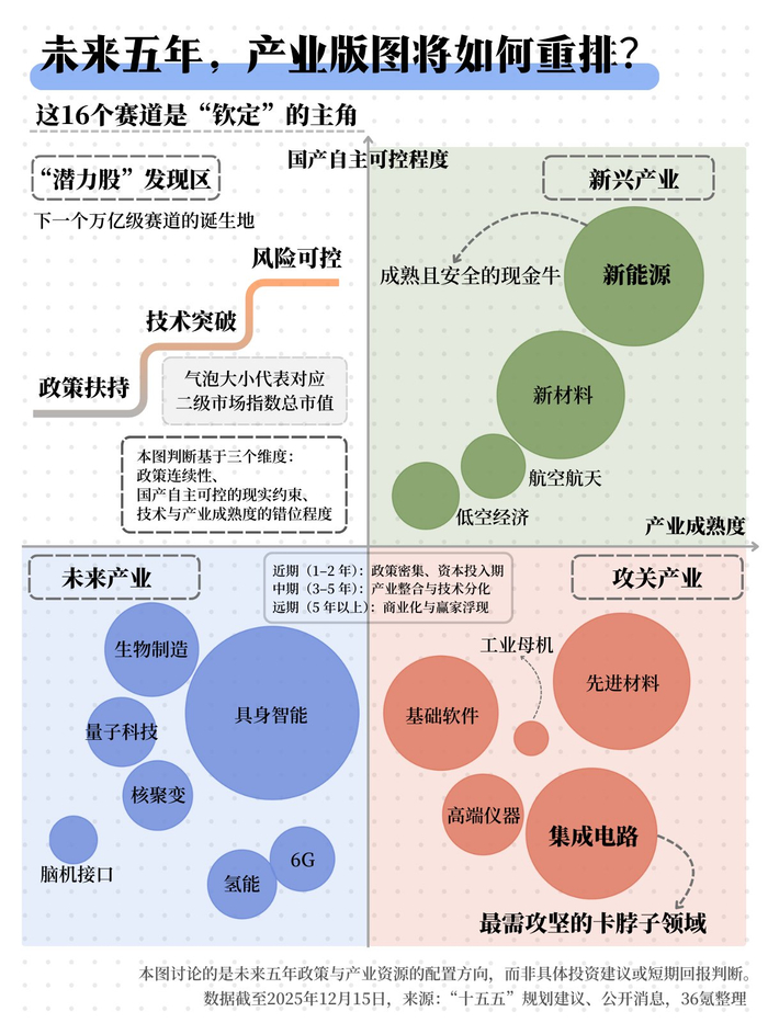 36氪制图首先,政策支持不再平均分配,而是高度集中。半导体、新材料、具身智能等16个赛道被明确推至前台,成为新周期中资源、资本与耐心最密集的方向;相应地,传统基建与地产的重要性持续下降。