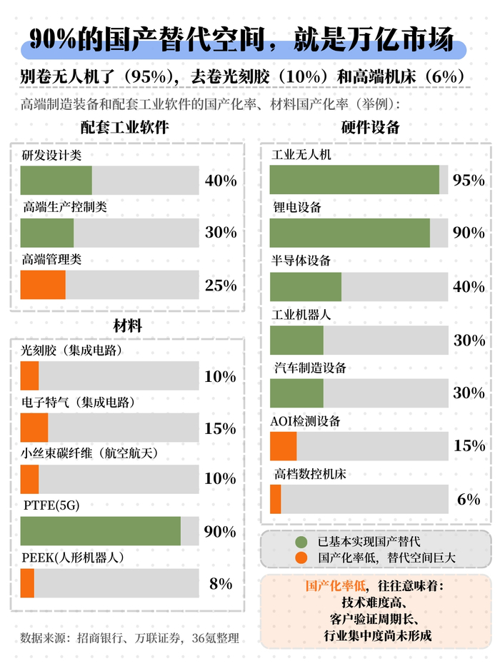 36氪制图其次,判断产业空间,不能只看是否“国产化”,而要看“国产率”处于什么阶段。国产率已接近饱和的领域,竞争趋于充分;而在光刻胶、高端机床、关键材料等国产率仍偏低的环节,往往意味着更长周期、更高门槛的攻关空间。