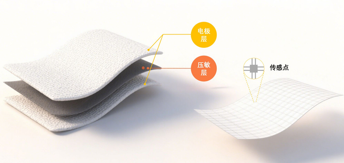 基于柔性织物基底的压力分布测试技术,其核心采用“三明治”结构压阻式设计,电极层呈横纵正交排布于压敏层两侧,能实现高密度、高一致性的压力点阵测量,并具备高灵敏、可拉伸、耐疲劳等类皮肤特性,可紧密贴合复杂曲面,适用于动态穿戴与长期使用场景。同时,通过进一步融合压力分布、动态姿态、接触识别等多模态感知能力,结合其自研算法,能实现对行为的精准分析与状态监测。
