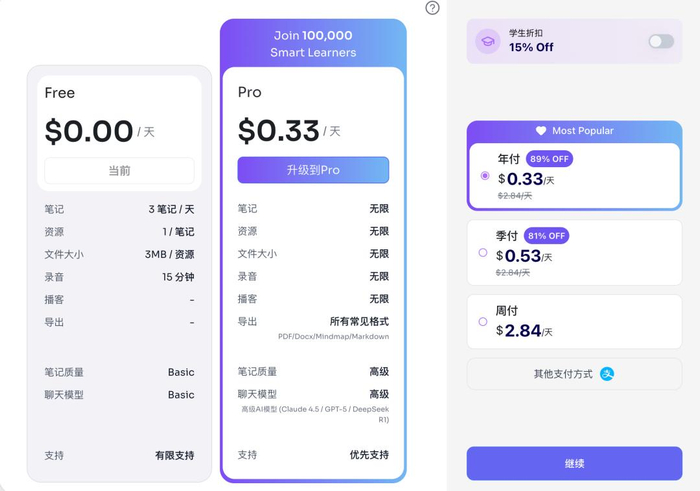 订阅付费,则是ThetaWave AI主要的商业模式。目前,产品提供了3档订阅模式:年付、季付,以及针对考前突击需求推出的周付。钟子湫告诉我们,ThetaWave AI的付费率维持在7%-8%,次月付费留存率为85%,处在健康的水平。