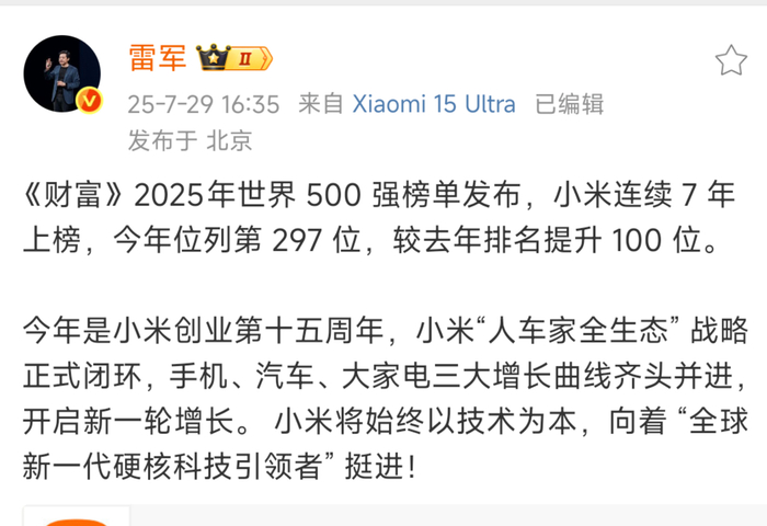 世界500强,意味着庞大的研发投入,小米年研发支出早已超百亿,今年更是要达到300亿元,具备复杂的全球供应链管理、以及跨越手机、AIoT、汽车等多个战线的战略协同能力。