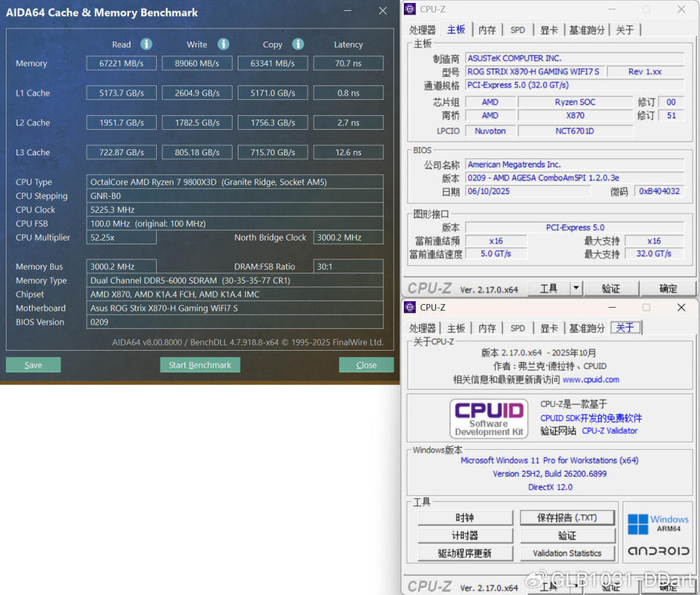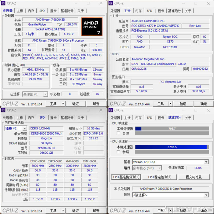 CPU-Z查看9800X3D参数与华硕 ROG STRIX X870-H GAMING WiFi S RO姬主板以及内存参数,CPU-Z Benchmark 测试成绩如图,测试时已开启PBO 2。