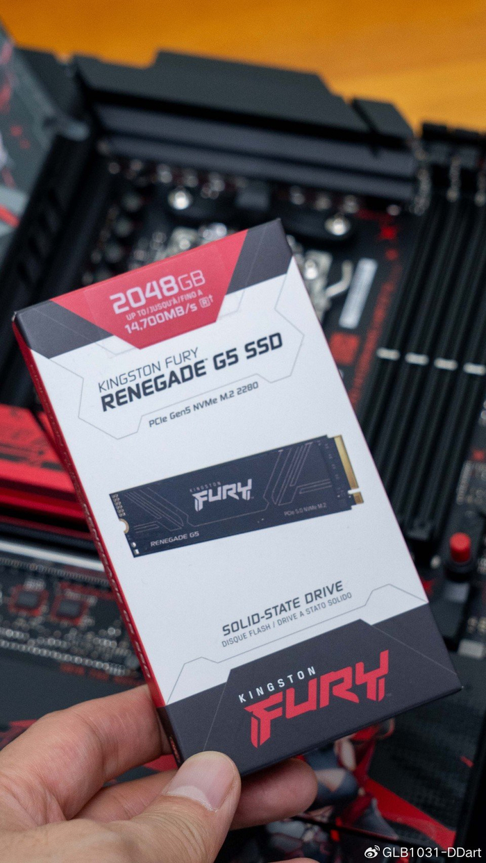 SSD方面选择了金士顿最近推出的FURY Renegade G5 PCIe 5.0 SSD产品,属于金士顿的FURY系列。我的是2TB容量版本,最高读取可达14700MB/s。也是目前市面上旗舰之选了,包装盒很小巧。正面可以看到产品容量与外观渲染图。