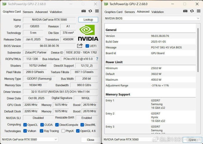 GPU-Z查看索泰 RTX 5080 AMP EXTREME INFINITY 显卡具体参数。