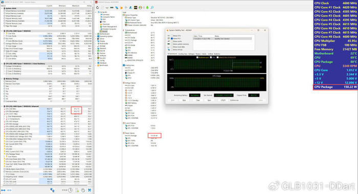 压力测试部分,在AIDA 64 FPU单烤情况下,因为设置了90℃功耗墙所以实际测试9800X3D处理器最高温度81.2 ℃,最高频率4.60 GHz,TDP 151 W。