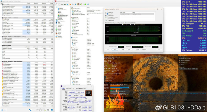 整机双烤测试,处理器最高温度82.4 ℃,最高频率4.88 GHz,TDP 152 W。GPU频率2692 MHz,显卡TDP 360 W,显卡核心温度 63℃。